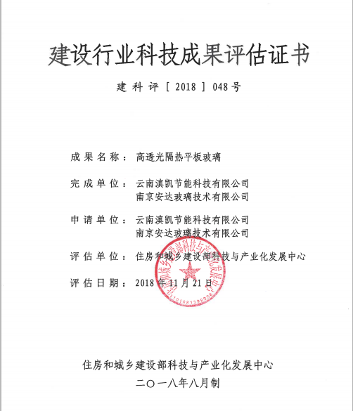 2018年11月21日,住房和城鄉建設部科技與產業化發展中心在北京主持召開了由云南滇凱節能科技有限公司和南京安達玻璃技術有限公司共同研發的“高透光隔熱平板玻璃”科技成果評估會,評估委員會認為:該產品光熱性能達到國際領先水平,符合國家產業發展方向,一致通過評估。